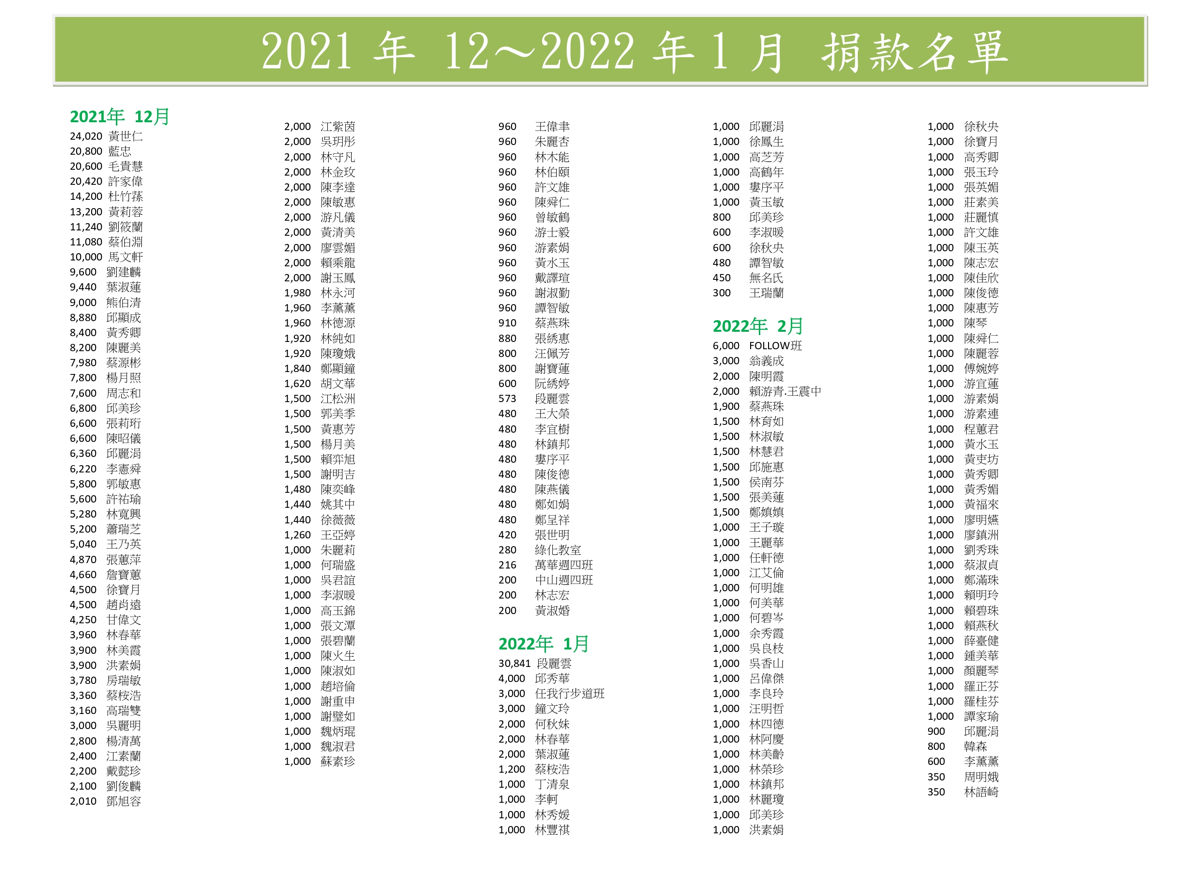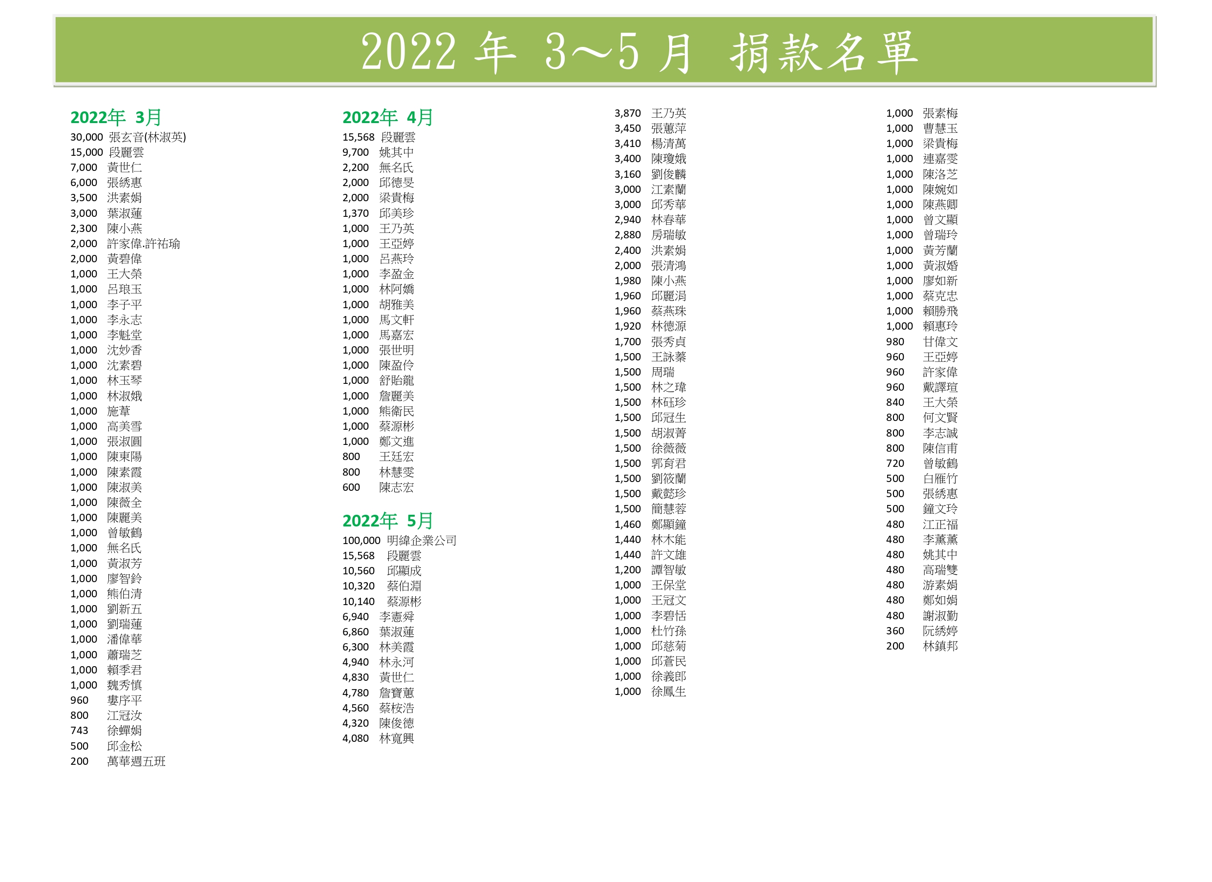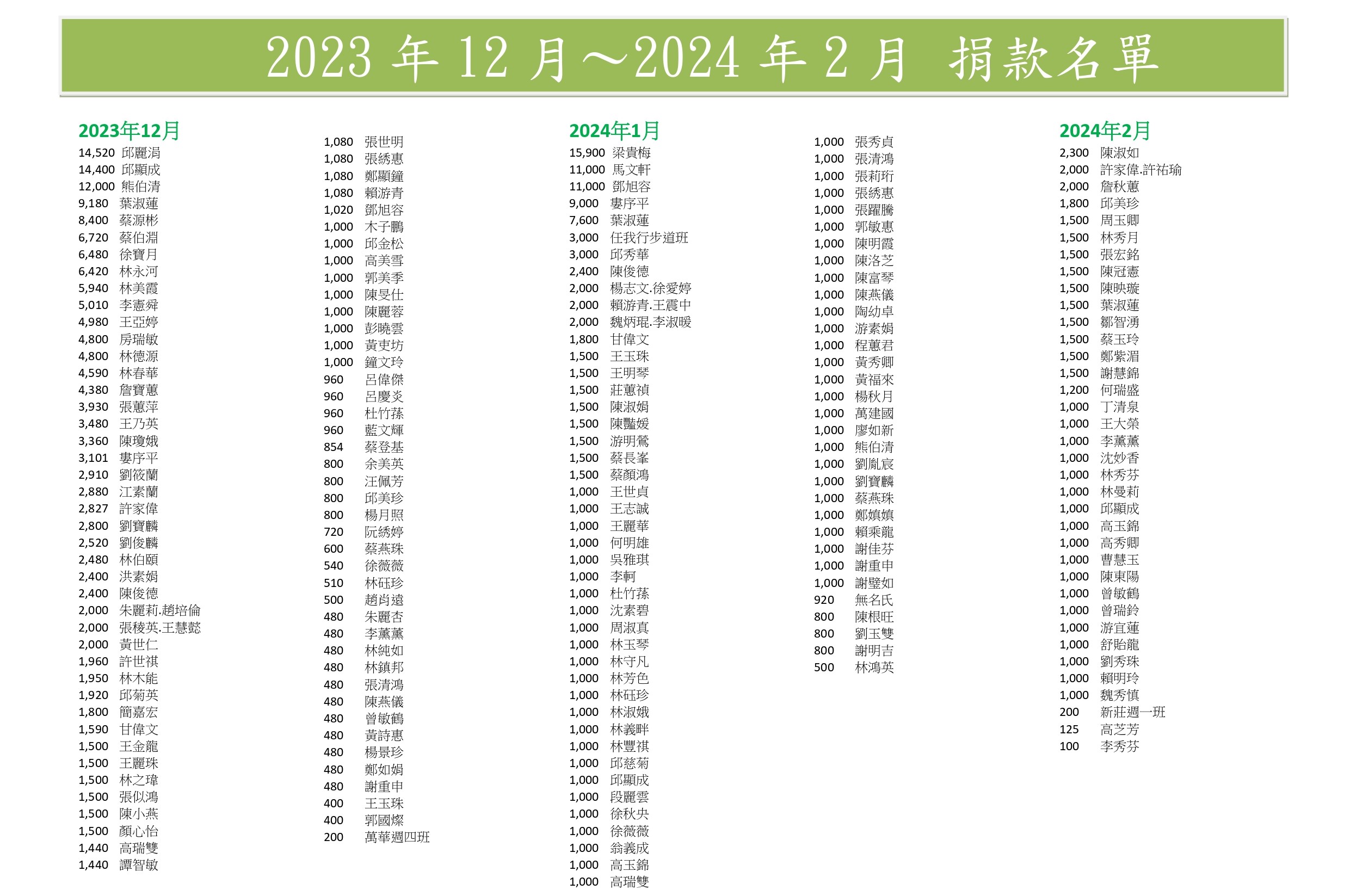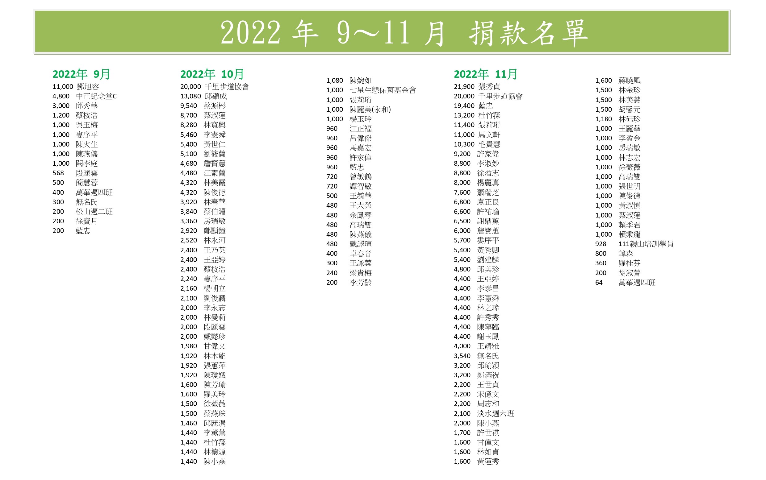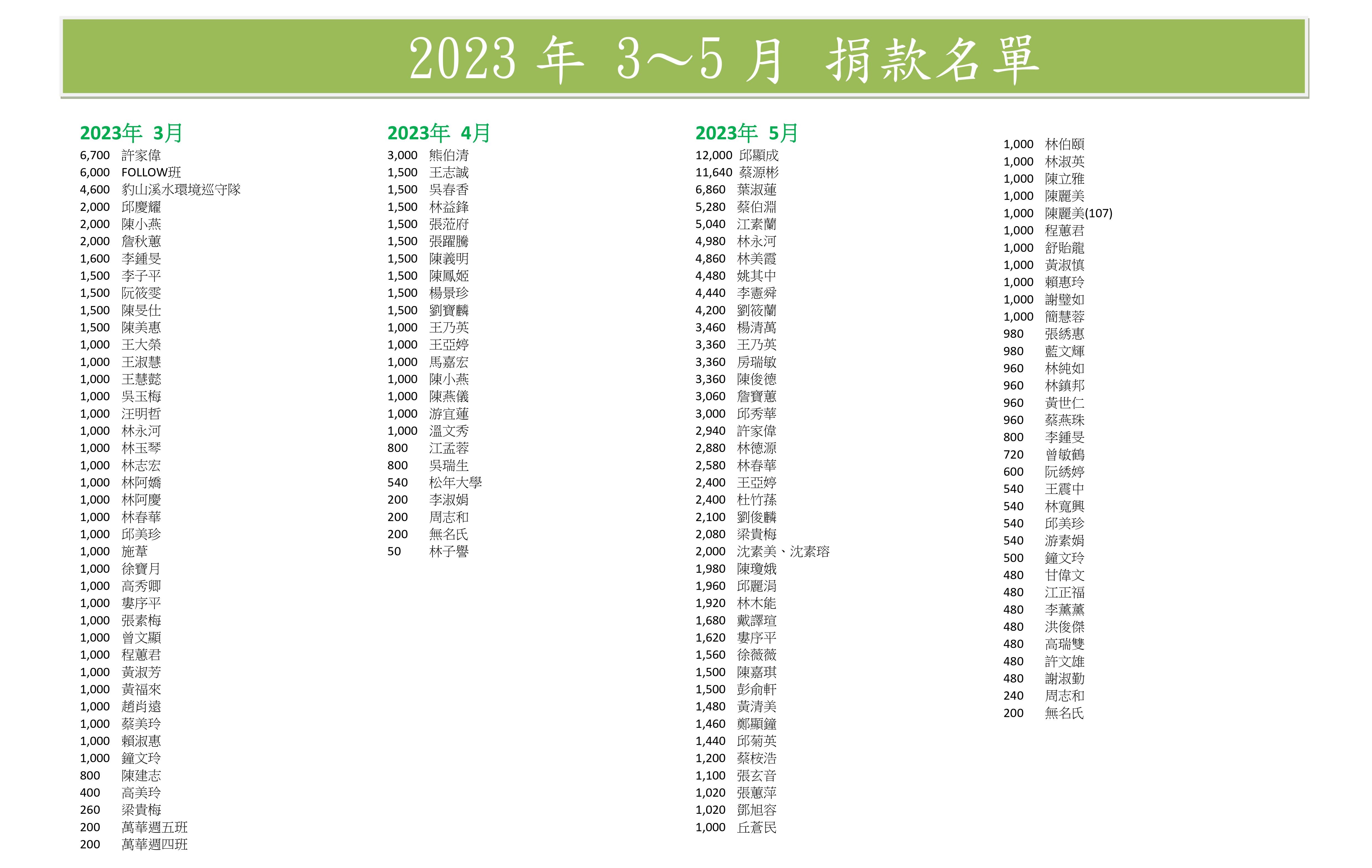 (以下表單為秘書處每季或年 公告捐款人名單及金額)