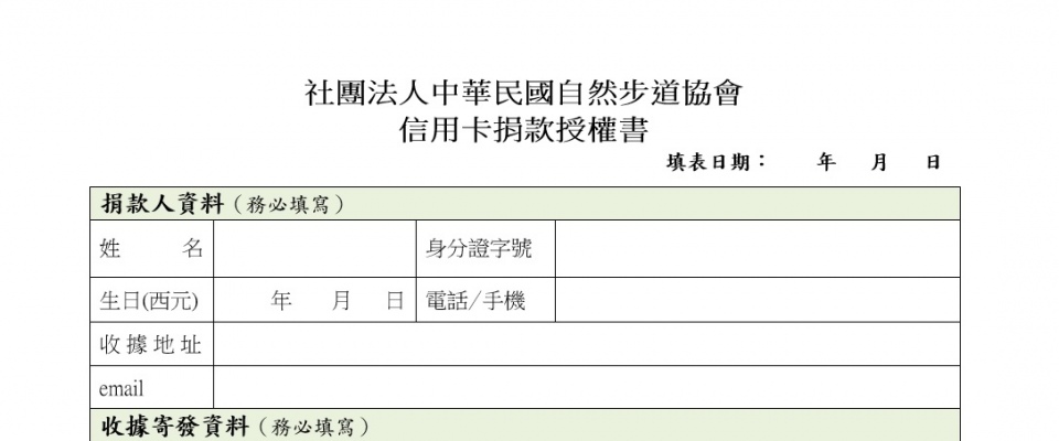 歡迎下載 信用卡付款授權書 直接填寫或用 線上捐款 直接進行信用卡捐款,或以劃撥、轉帳的方式均可,歡迎來電詢問詳情。對以捐款收據抵稅等事項如有不清楚之處,也歡迎直接與自然步道協會秘書們聯繫,電話:02-23025265。