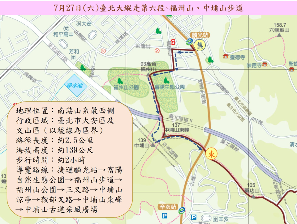 - 活動路線:臺北捷運麟光站→富陽自然生態公園→福州山步道→福州山公園→三叉路→中埔山涼亭→鞍部叉路→中埔山東峰→中埔山登山口古道采風廣場。