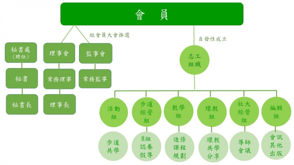 本會是由對生態保育、環境教育理念認同,希望藉由自然步道解說來傳達理念的解說志工(綠人)自發性成立的。屬於非政府組織(Non-Governmental Organization, NGO)及非營利組織(Non-Profit Organization, NPO)。