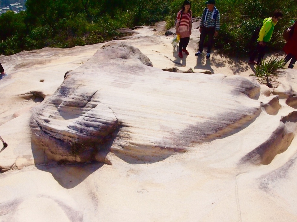 地質軍艦岩的地質是以二千四百萬年前~二千二百萬年前沈積的木 山層為主,需仔細觀察其岩層形狀、顏色,甚至用手觸摸、感覺,方可體會古老地層多變化 的地質景觀,精采萬分。 (一) 雪白的砂岩是濱海的證據: 海濱或河口的淤沙經過海水的淘洗,沈積成雪白的砂粒,再經久遠歲月的膠結作用,成為厚層堅硬的砂岩。 (二) 「濱海相」交錯層: 交錯層通常發生在水流速度較快的河口、海濱淺水地區,水流帶的泥沙沿著淺海緩坡斜面逐漸向前推積,形成一層層平行的岩層中許多斜交的紋路。 (三) 富含煤層: 海濱陸域的各種植物遇到海水上升,植物體經過長時間掩埋,炭化成煤層,至今仍留有多處廢棄的煤礦坑道。 (四) 砂、頁岩層交互層: 攀岩場的岩壁上,鬆軟凹陷的頁岩和堅硬凸出的砂岩,形成上下有序的波狀交互層。 (五) 彩色的風化紋: 步道階梯上的美麗紋路源自於岩層中所含大量的礦物,因岩石裸露後經氧化作用,產生深淺不同的鐵褐色。 |