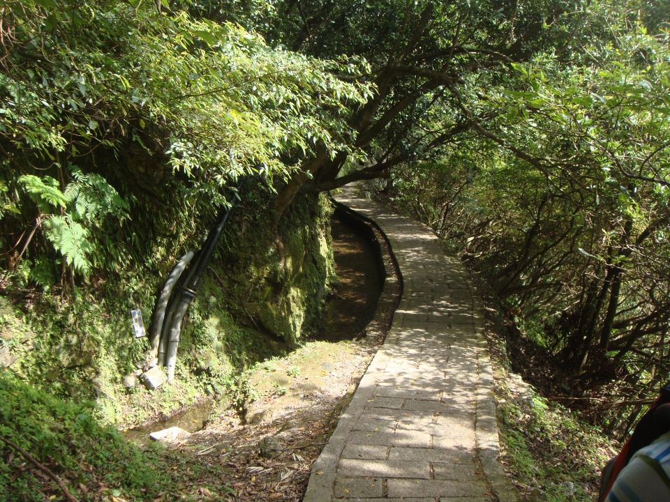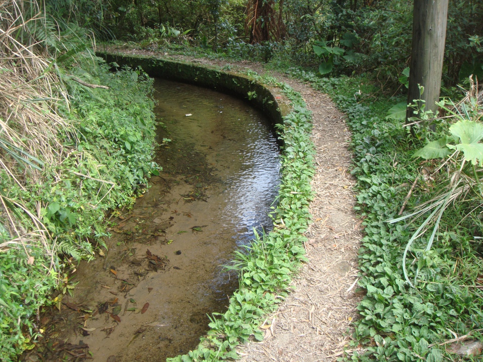 (山)山中奇緣 坪頂古圳步道大約位在海拔300至500公尺範圍內,清風亭附近是步道的最高點,由此沿花崗岩步道而下,轉彎處,紅楠、柃木、紅淡比、燈稱花夾道,還有樟樹、無患子、相思樹、芒草、竹子和月桃花。步道入口處立有陽明山國家公園的界碑,過了界碑內便屬於國家公園管轄。平等里(古稱「坪頂」)位於七星山脈東緣,地勢呈北高南低,北邊有多座800公尺以上的山峰,如天梯嶺(861公尺),擎天崗(800公尺)環繞,南邊青礐溪谷(海拔250公尺);東西各有內雙溪及青礐溪,而內寮溪貫穿其中。土壤類型以灰黃色幼黃壤分布最廣,其次是黃壤、紅壤及少量之石質土(安山岩、火山碎屑)再次之。這裡的聚落位於海拔約450公尺高的山地丘陵平坦處,春天多霧,夏、秋季氣候涼爽,冬天因受東北季風影響,氣候溼冷,偶有機會見到冰雹。溫度大約與臺北市相差4到5度,主要降雨為東北季風、梅雨、熱雷雨、颱風和鋒面雨。 每年冬天,東北季風在臺北盆地北端屏障--大屯火山群的山林小徑狂奔竄逸,住在風口的綠色精靈們,如:紅楠、柃木、紅淡比、奧氏虎皮楠、樹杞和大明橘等植物,早己練就一身抵禦寒風的功夫,儼然成為稜線勇士一族。 生活命脈-水圳(水)由清風亭前石階直下不遠處,一條?澈的小水溝躍然眼前,目光順著水流來到山洞口,出現「坪頂古圳」四個大紅字,碑上刻有「道光十五年(西元1835年)開建」等字樣;佇立片刻,陣陣涼風迎面;沿著土堤圳溝而行,魚兒水中游,蝶蛾環繞,蟲鳴鳥唱,還有保育類昆蟲無霸勾蜓卿卿我我連結飛行,彷彿置身人間仙境。 步道往下,另有二條水圳與古圳平行,分別是西元1849年及1909年闢建的坪頂新圳和登峰圳;在這兒可以看到不同時期開鑿圳溝的工法,有以石塊堆疊,或用水泥施作,與古圳的自然土堤相異其趣。 |