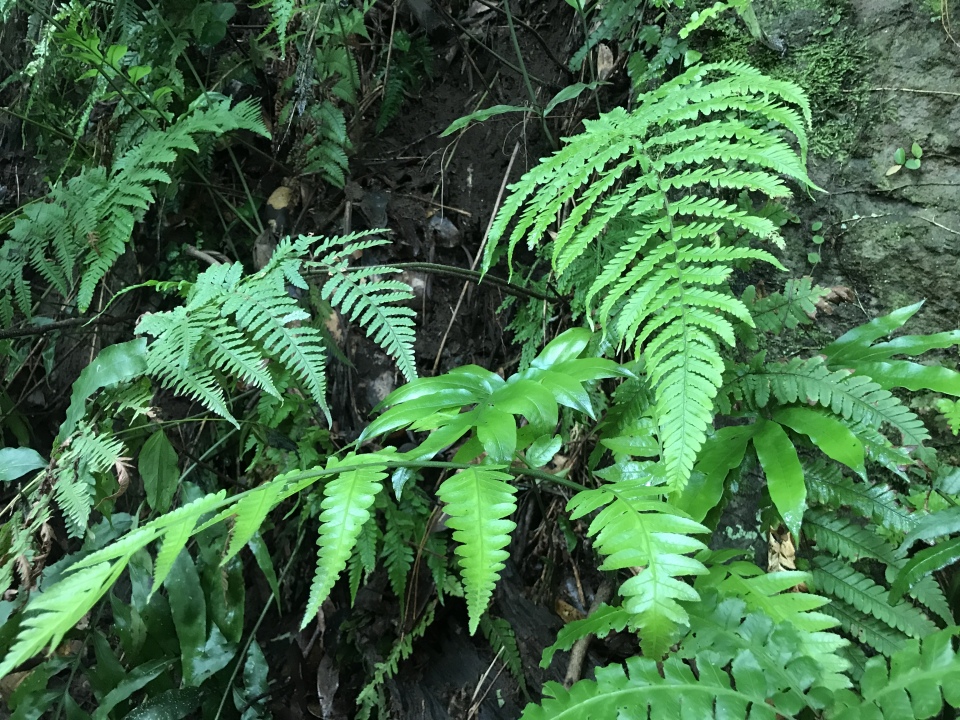 走在樟湖步道林蔭下,路旁陸續出現各種蕨類,數量最多的是俗稱「山過貓」的廣葉鋸齒雙蓋蕨。廣葉鋸齒雙蓋蕨與在市場上常見的野菜--俗稱過貓的過溝菜蕨相似,都屬於蹄蓋蕨科,也都可以當作野菜來吃。