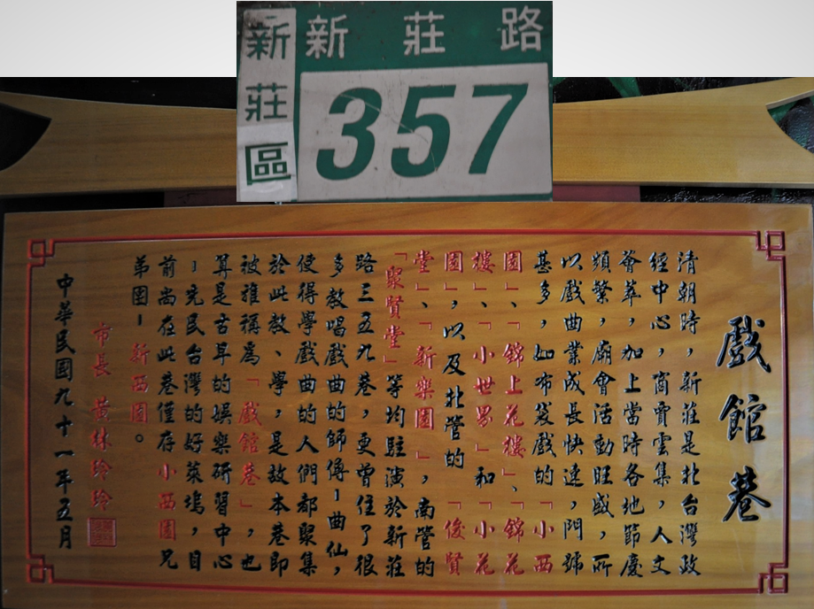 (二)戲館巷:位於新莊路359巷,默默訴說著新莊曾經富庶繁榮的歷史。巷內有不少歌仔戲、布袋戲班進駐,還有師傅教學,著名的小西園布袋戲也曾在此巷弄駐足。