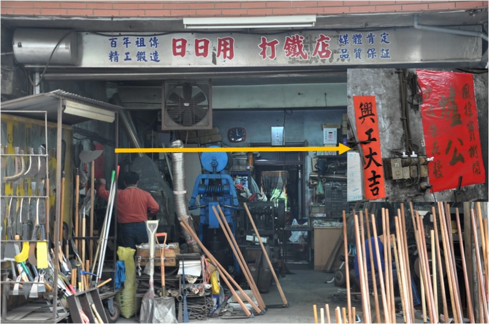 新莊廟街百年老店--日日用打鐵店:創辦者王金磚於日治大正2年(1914年)在新莊路創立,以打鐵製造農具為主業,並製造各種刀具,打造的刀子上都會刻上一個「日」字,曾享譽國際,還贏得「新莊打鐵王」的美號。如今接手的第三代傳人王崇德,是現今新莊唯一擁有打鐵鍛造技術的工匠,依舊堅持手工鐵鍛,那鏗鏘有力的覆搥打聲,已然是新莊人無法忘懷的絕響。