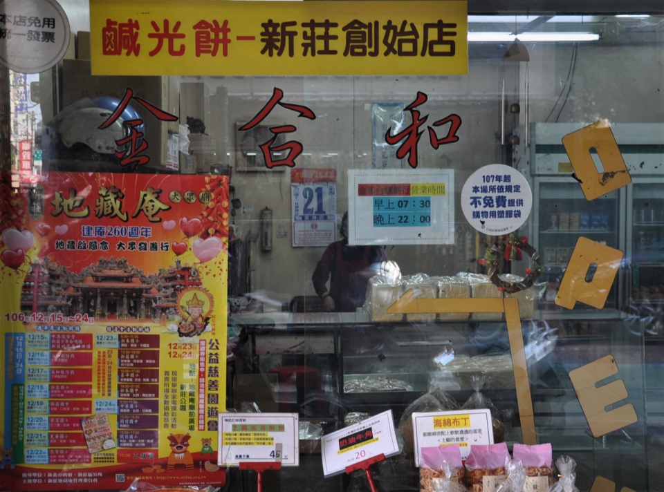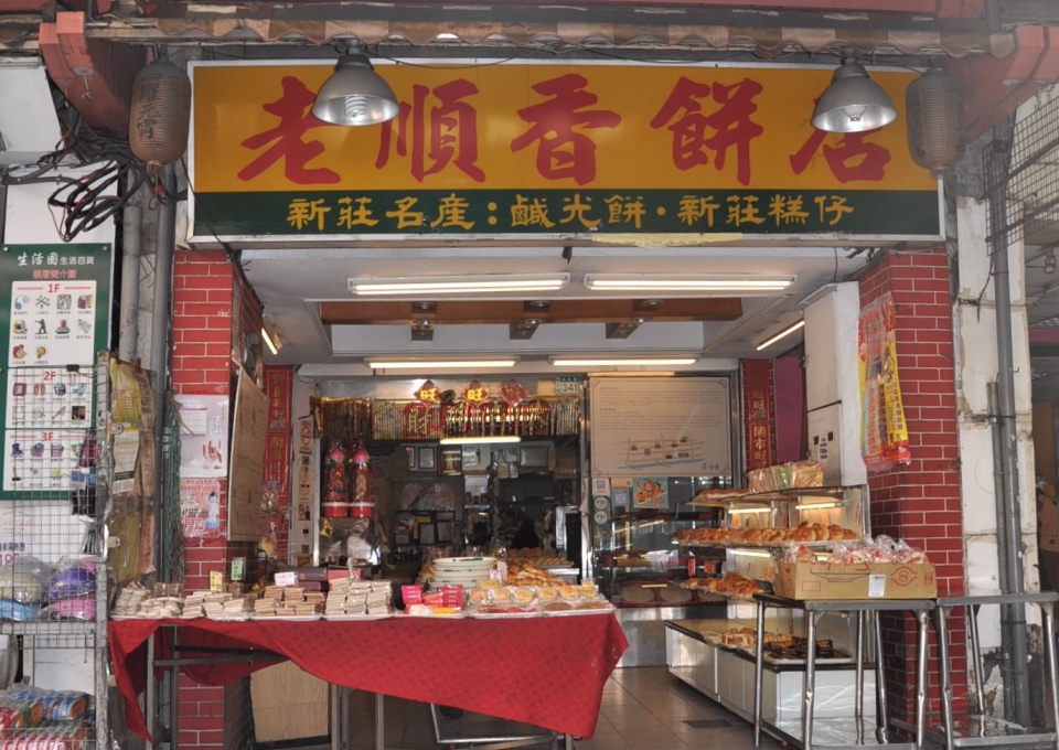 新莊廟街百年老店--老順香餅店:已傳至第四代,主人王明朝堅持手工製作,延續祖先遺留的傳統作法,傳承古早味,絕不偷工減料,每年大眾爺出巡前,都要用掉上萬斤麵粉製作鹹光餅。鳯梨酥及用模具印出傳統圖案的粿皆知名。
