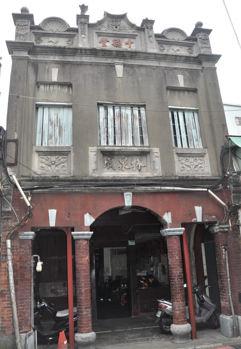 十德堂。閩南式屋身,但採用當時引進的鋼筋及水泥為結構,立面山牆則加上日據時期風行的細部裝飾。一樓的拱形開口處以拱心石為裝飾,廊柱的柱頭及柱底也都有幾何線條裝飾,都是當時流行的建築樣式。