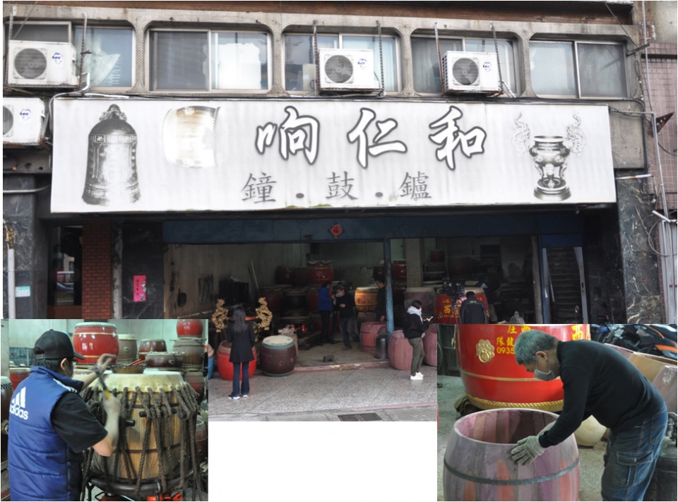 响仁和鐘鼓場:店名會取名為『响仁和』,意思是傳達「仁」者之音,產生共鳴,並廣得人「和」,建立永久的事業。創始人王阿塗先生從泰山蔡媳婦製鼓師父處習得製鼓技巧,在某種因緣之下,蔡家後繼無人,遂將整套製鼓工具贈予『响仁和』使用經營。第二代傳人王錫坤將所學融入商業經營中,使得『响仁和』更具規模。目前『响仁和』的名號已經傳遍台灣,蜚聲海外,成為了高品質鼓的代名詞。