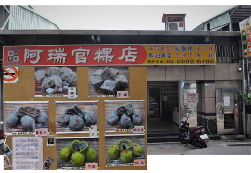 新莊廟街百年老店--阿瑞官粿店:靠近捷運頭前庄的百年古早味草仔粿(料多實在還有肉)、芋粿巧、南瓜粿、彌月油飯等。