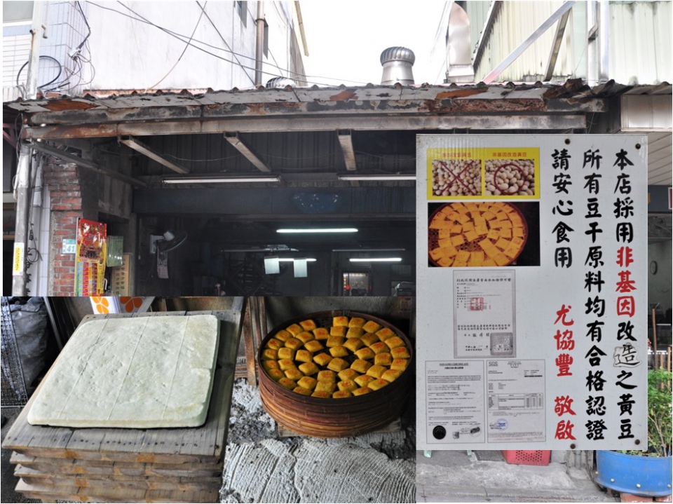 新莊廟街百年老店--尤協豐豆干店:來到這邊看看豆漿豆腐的製作,順便喝一杯豆漿是最幸福不過的事情了。尤協豐的特色在於碳烤豆乾,將清郁的炭香和略帶鹹味的黃豆結合在一起,入口香醇美味,獨具特色,讓新莊老街上常瀰漫著一股烘烤豆乾的香味。