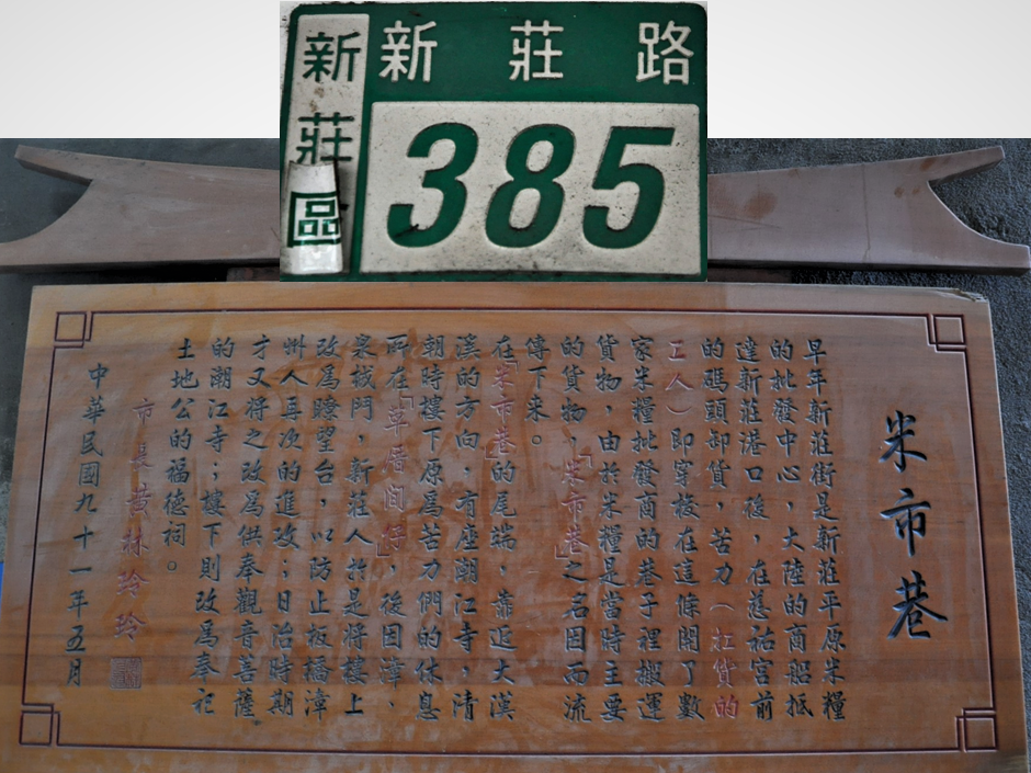 (一)米市巷:位於新莊路387巷,連接五十六坎的米市街,是一條以米業為主的巷道,過去新莊米的進出皆由此巷口的河岸碼頭搬運,此處是商賈聚集的地區。