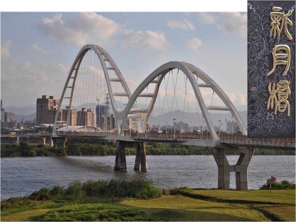 新月橋:夕陽西下,夜幕低垂時,不對稱的大小鋼拱橋身,搭配七彩光影變化,營造出令人讚嘆的美麗,已成為新北市的特色景點。新月橋是大漢溪上一座專供行人及自行車通行的橋樑,一座綿延725公尺的大橋,連接了新莊廟街及板橋435特區。