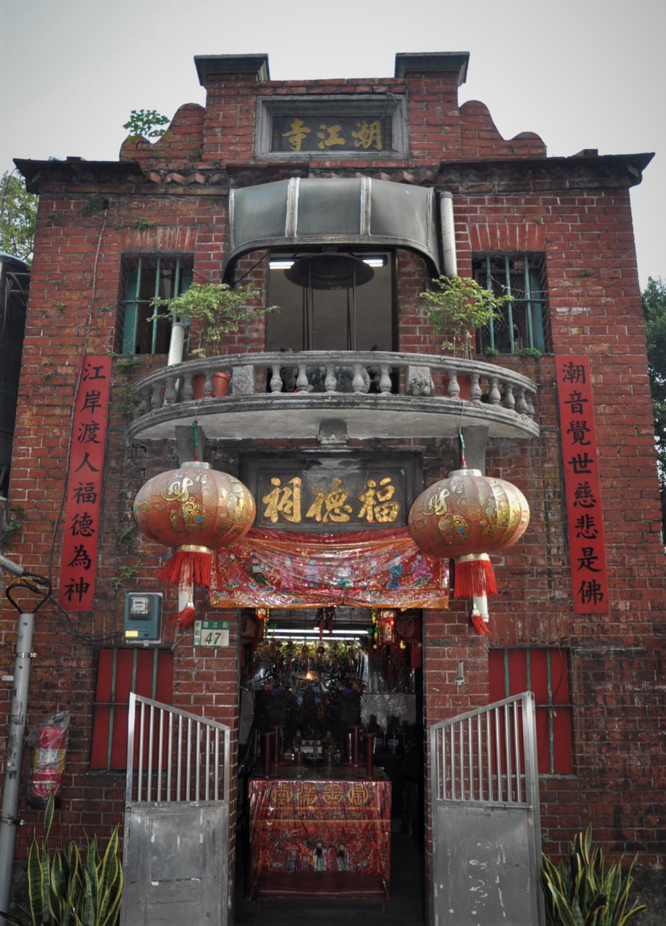 新莊潮江寺與福德祠:米市巷底有一棟紅磚樓房古厝,原本是米市巷的碼頭工人作為休息的寮房。新莊人為防範板橋的漳州人,在樓上設立瞭望台,以做警戒之用。日據時期,才將這棟樓房改為「潮江寺」作為寺廟使用迄今。其建築並不採用一般民間慣用的宮殿式建築,而是以馬背屋頂(金形)的形式,二樓供奉觀音佛祖,樓下為福德祠供奉土地公。