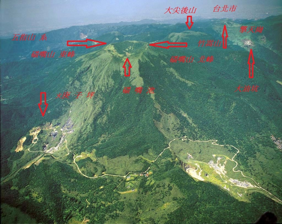 在20餘座的火山群裡,今天唯一保存明顯的火山口地形是磺嘴火山,火山口邊緣最高處是右側被稱為磺嘴北峰(912米),夏季前後雨季或颱風過後積水於火山口,又稱為磺嘴池。