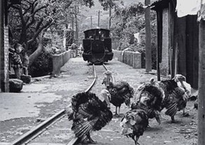 ⬅️猴硐早年的生活景象(礦業火車頭與火雞,由周朝南先生提供)