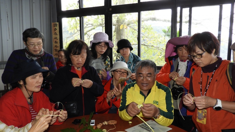 手編植物是我這次參加的主要目的,完全衝著芒萁而來,尤其沒有用過這種植物編出的民俗物品,因為平時有在帶童軍活動,所以特別想學習用此素材,當馬老師拿出編好的樣本時我眼睛更亮了,這不是海童軍用的領圈嗎?這種編織法不太容易但卻很漂亮,也是我很喜歡的一種領圈,也是原住民常用的手環編織,心中直叫「來對了」「來對了」也跟對了老師,經馬老師耐心指導後不但學會了還真用了芒萁莖的芯編了一個領圈,原來取下芯之後要趁軟快速編織不然等到硬了之後就不行使用了。編好之後會慢慢變色,經過一天後顏色美極了,大家不妨試試看。