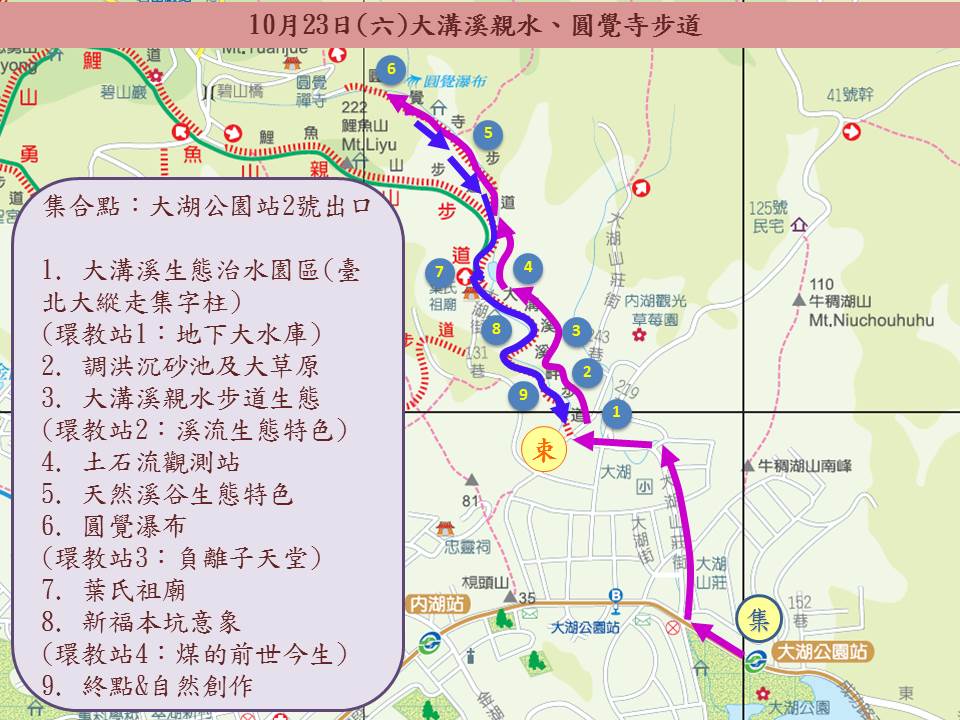 2. 活動路線:捷運大湖公園站2 號出口→大溝溪調洪沉砂池→親水步道生態→土石流觀測站→圓覺寺步道→圓覺瀑布→大溝溪溪畔步道→葉氏祖廟→碧湖步道口→大溝溪溪畔公園。