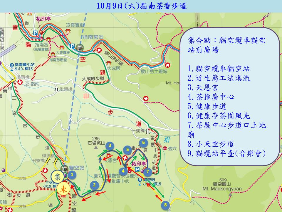 2. 活動路線:貓空纜車貓空站前廣場(起點)→指南路三段→天恩宮→茶推廣中心→健康步道→茶展中心步道口土地公廟→小天空步道→貓空纜車貓空站前廣場平台(終點)音樂會、領紀念品。