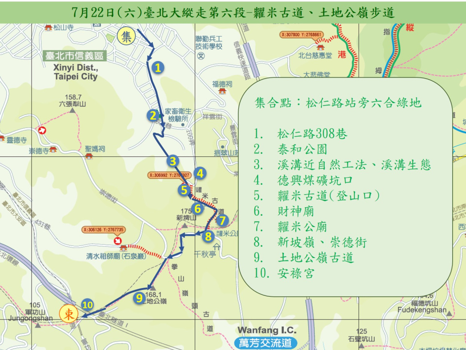 - 活動路線:松仁路站旁六合綠地→松仁路308巷→泰和公園→吳興街600巷100弄→德興煤礦坑口和「新坡嶺糶米公廟」的牌樓→財神廟→糶米公廟→新坡嶺、崇德街→土地公嶺→安祿宮
