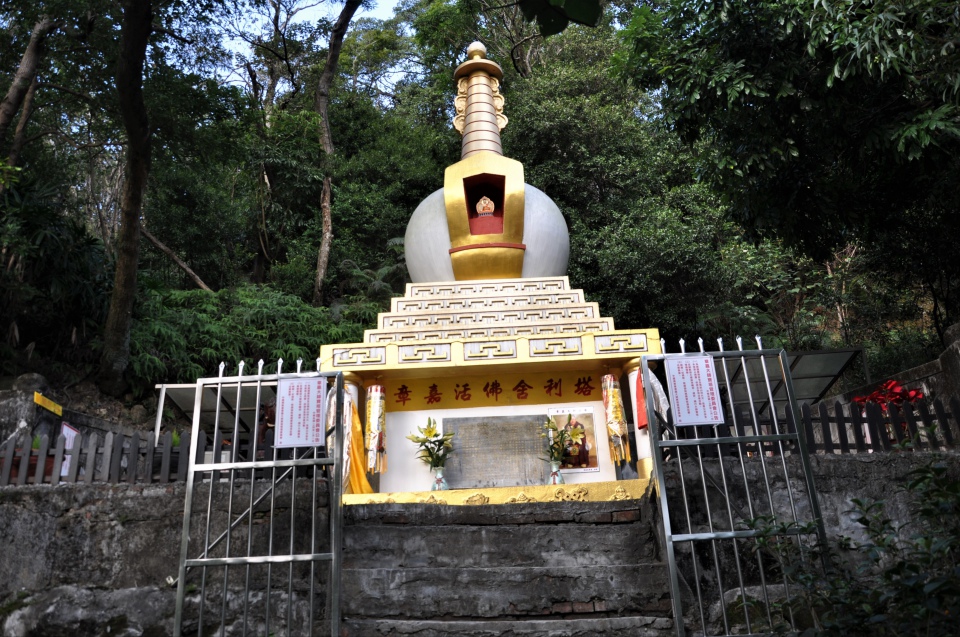 章嘉活佛舍利塔:再往上即到達章嘉活佛舍利塔,依塔前釋印順導師撰文內容,可知活佛名稱來自「章嘉呼圖克圖」封位,位居藏傳佛教四大喇嘛之一(章嘉活佛世系與達賴、班禪、哲布尊丹巴並稱為四大活佛)。也是神州變色後,唯一跟隨國府到台灣的活佛,民國46年3月4日遽返冥真,世壽68,荼毘得舍利六千。