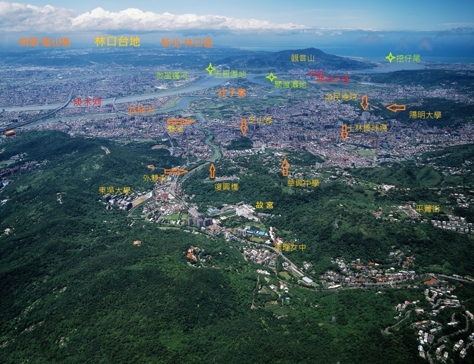 臺灣有四個較大盆地—臺北、臺中、埔里、東河。臺北盆地面積雖不是最大,但擁有最豐富的人文與自然多樣性。而臺北盆地南北二十餘公里,東西近18公里,其中的北側如這張空照圖所拍攝,又是各種分野知識的大總匯。