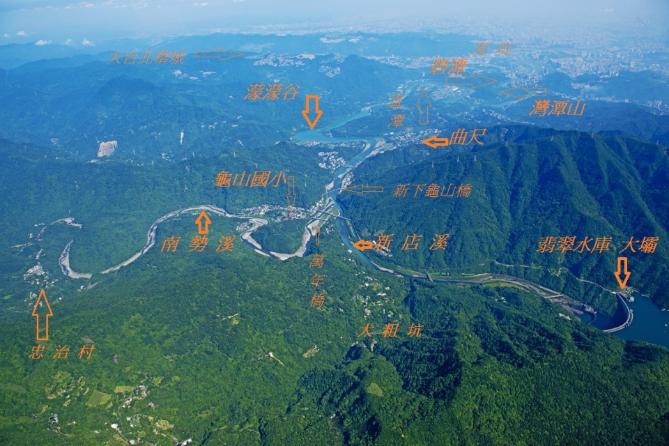 從空照圖,讓我們清楚掌握新店溪的兩大支流的狀態,圖左是南岸的溪河是南勢溪,圖右是翡翠水庫出水口的北勢溪,兩溪在桂山橋附近匯流而成新店溪,溪流繞過幾彎在直潭淨水廠過濾後,才供應給大臺北地區的500萬人飲用。